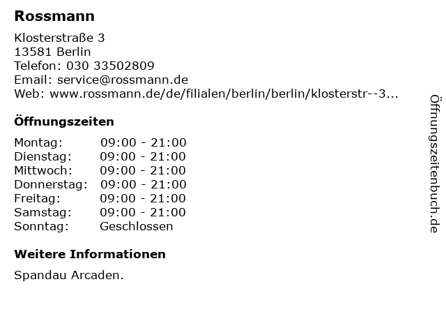 | Öffnungszeiten Rossmann in Berlin anzeigen | |
