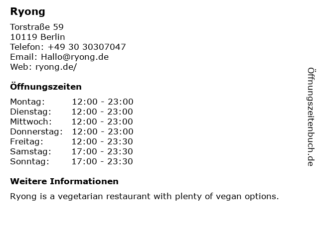 | Öffnungszeiten Ryong in Berlin anzeigen | |