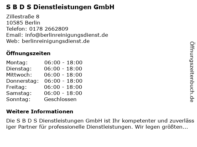 | Öffnungszeiten S B D S Dienstleistungen GmbH in Berlin anzeigen | |