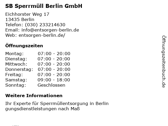 | Öffnungszeiten SB Sperrmüll Berlin GmbH in Berlin anzeigen | |