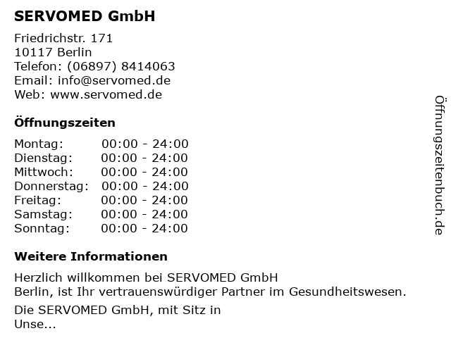 | Öffnungszeiten SERVOMED GmbH in Berlin anzeigen | |