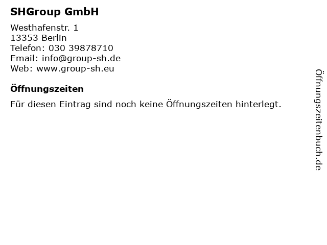 | Öffnungszeiten SHGroup GmbH in Berlin anzeigen | |