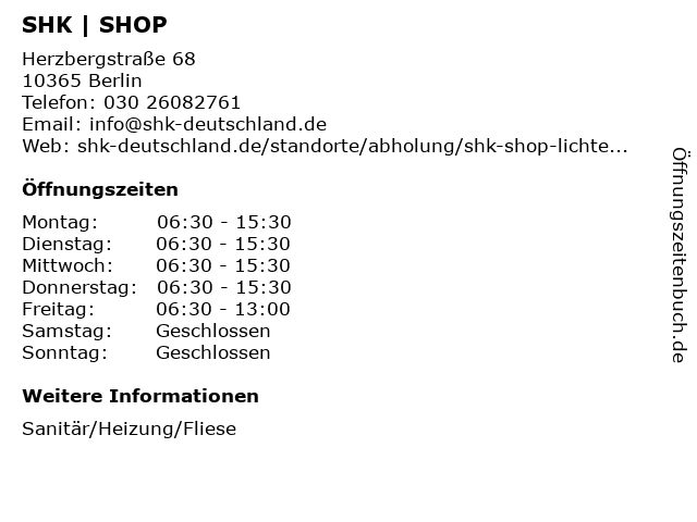 | Öffnungszeiten SHK | SHOP in Berlin anzeigen | |