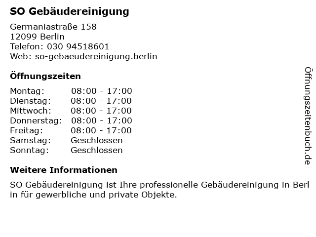| Öffnungszeiten SO Gebäudereinigung in Berlin anzeigen | |
