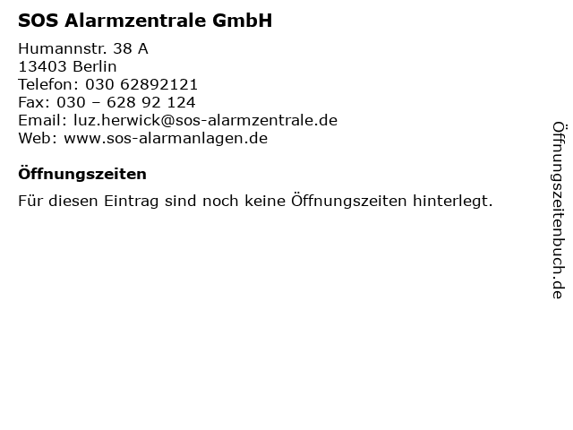 | Öffnungszeiten SOS Alarmzentrale GmbH in Berlin anzeigen | |