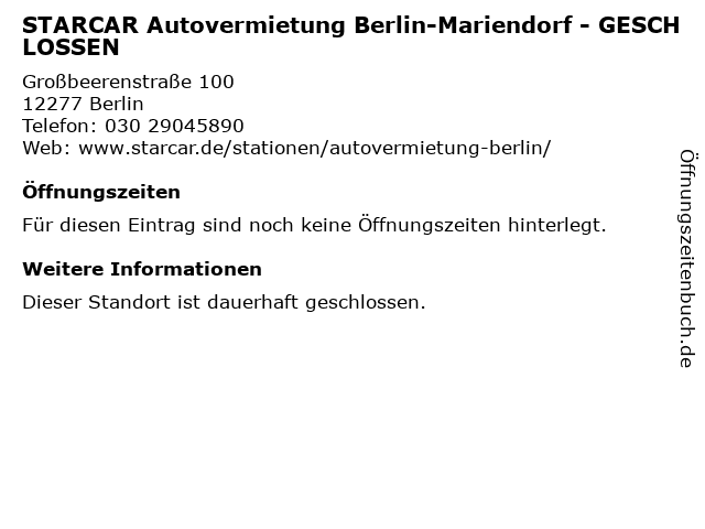 | STARCAR Autovermietung Berlin-Mariendorf - GESCHLOSSEN anrufen | |