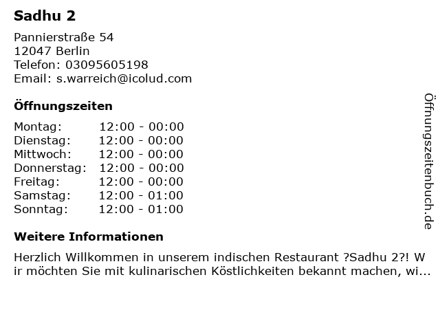 | Öffnungszeiten Sadhu 2 in Berlin anzeigen | |