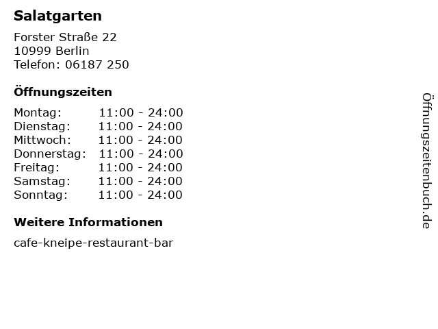 | Öffnungszeiten Salatgarten in Berlin anzeigen | |
