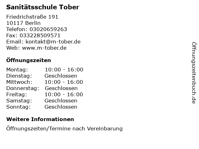 | Öffnungszeiten Sanitätsschule Tober in Berlin anzeigen | |