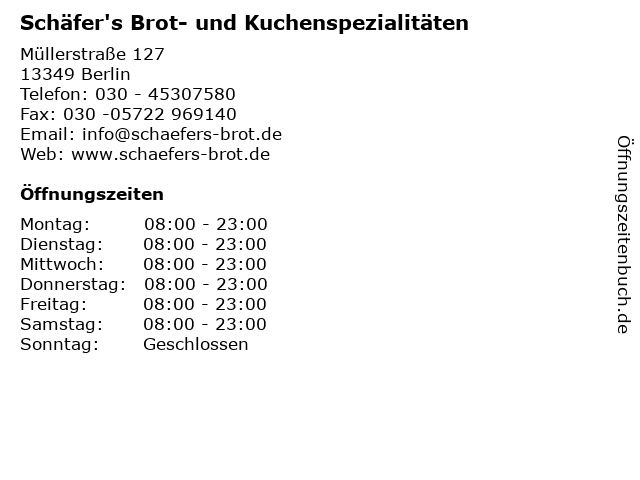 3 Schäfer's Brot- und Kuchenspezialitäten (Entfernung: 6,38 km) Platz der Vereinten Nationen 14, 10249 Berlin 6 |