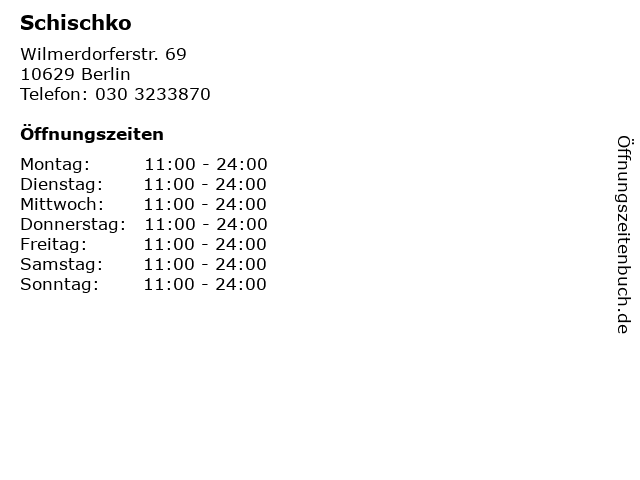 | Öffnungszeiten Schischko in Berlin anzeigen | |