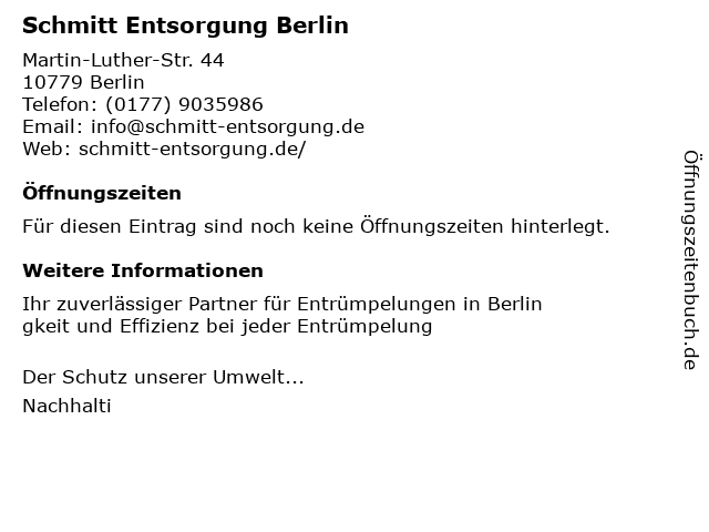 | Öffnungszeiten Schmitt Entsorgung Berlin in Berlin anzeigen | |