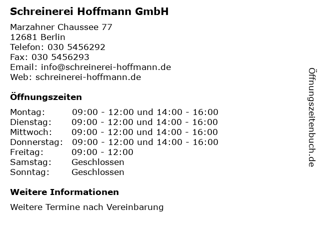 | Öffnungszeiten Schreinerei Hoffmann GmbH in Berlin anzeigen | |
