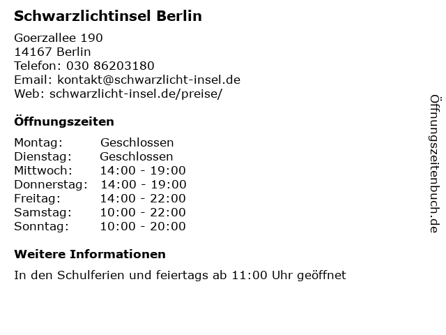 | Öffnungszeiten Schwarzlichtinsel Berlin in Berlin anzeigen | |