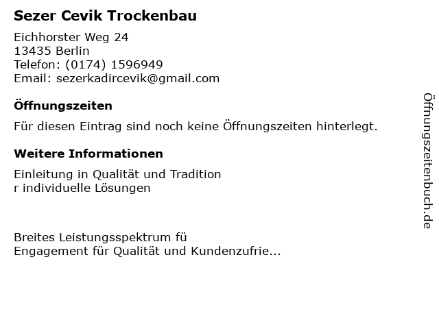 Öffnungszeiten Sezer Cevik Trockenbau in Berlin anzeigen | |