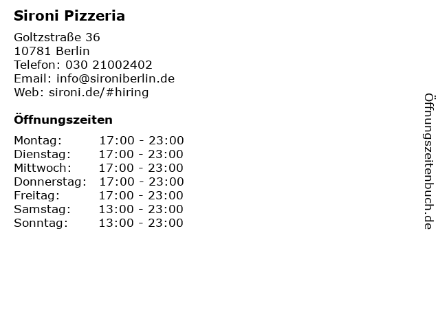| Öffnungszeiten Sironi Pizzeria in Berlin anzeigen | |