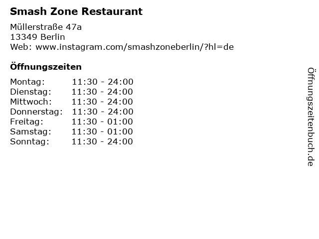 | Öffnungszeiten Smash Zone Restaurant in Berlin anzeigen | |