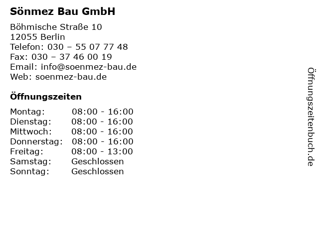| Öffnungszeiten Sönmez Bau GmbH in Berlin anzeigen | |