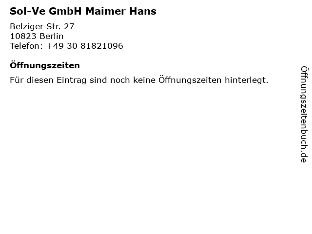 | Öffnungszeiten Sol-Ve GmbH Maimer Hans in Berlin anzeigen | |