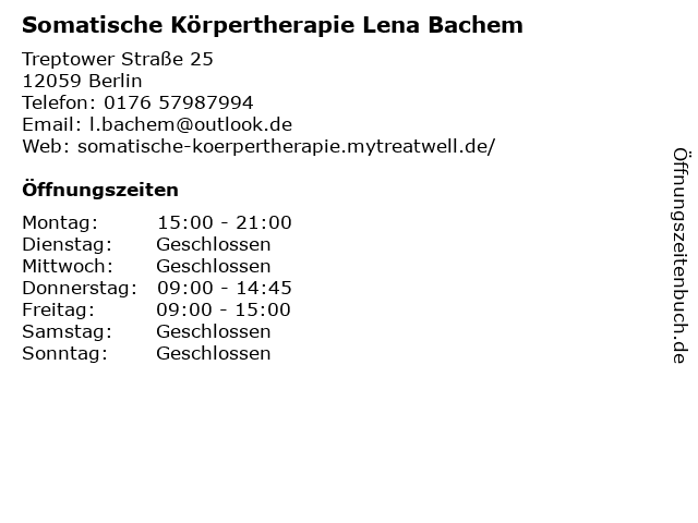 4 Tantra, Körpertherapie und Bioenergetik Ilka Stoedtner (Entfernung: 5,70 km) Bautzener Straße 3, 10829 Berlin 6 Praxis für Naturheilkunde & Körpertherapie Heilpraktiker Christian Maier (Entfernung: 5,83 km) Liselotte-Herrmann-Straße 3, 10407 München |