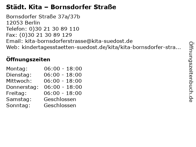 1 Humanistische Kindertagesstätte Bornsdorfer Strasse (Entfernung: 0,18 km) Bornsdorfer Str. 14, 12053 Berlin 4 Kindertagesstätte Böhmische Straße - Kindertagesstätten SüdOst Eigenbetrieb von Berlin (Entfernung: 0,73 km) Böhmische Straße 1, 12055 Berlin 6 Vivantes Klinikum Neukölln - Psychiatrie, Psychotherapie und Psychosomatik (Tagesklinik Emser Straße) (Entfernung: 0,77 km) Emser Str. 31, 12351 Berlin |