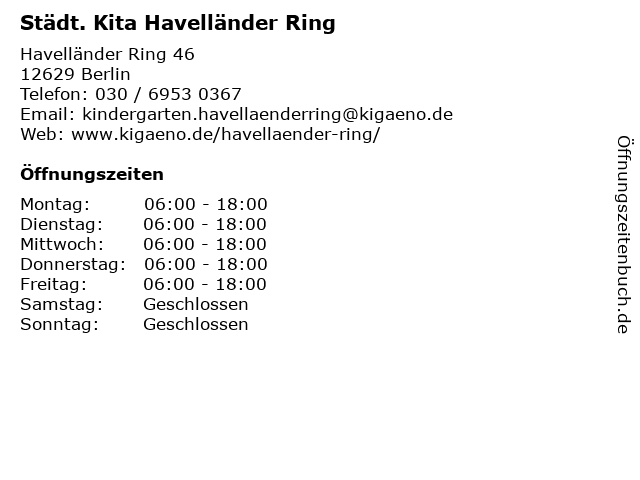 | Öffnungszeiten Städt. Kita Havelländer Ring in Berlin anzeigen | |