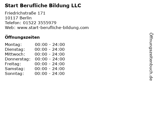 | Öffnungszeiten Start Berufliche Bildung LLC in Berlin anzeigen | |