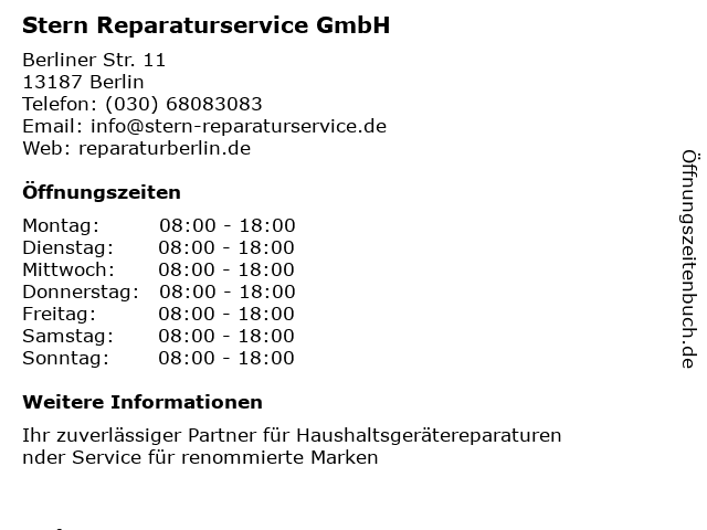 | Öffnungszeiten Stern Reparaturservice GmbH in Berlin anzeigen | |