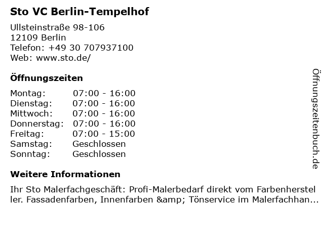 | Öffnungszeiten Sto VC Berlin-Tempelhof in Berlin anzeigen | |