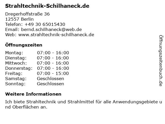 | Öffnungszeiten Strahltechnik-Schilhaneck.de in Berlin anzeigen | |