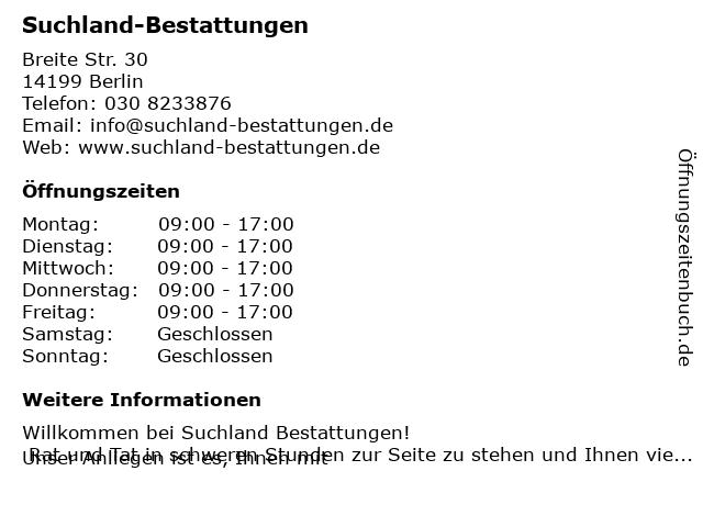| Öffnungszeiten Suchland-Bestattungen in Berlin anzeigen | |