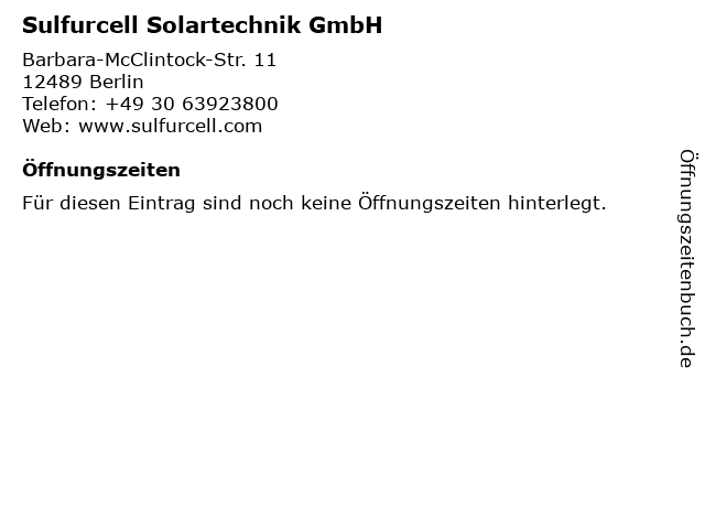 | Öffnungszeiten Sulfurcell Solartechnik GmbH in Berlin anzeigen | |