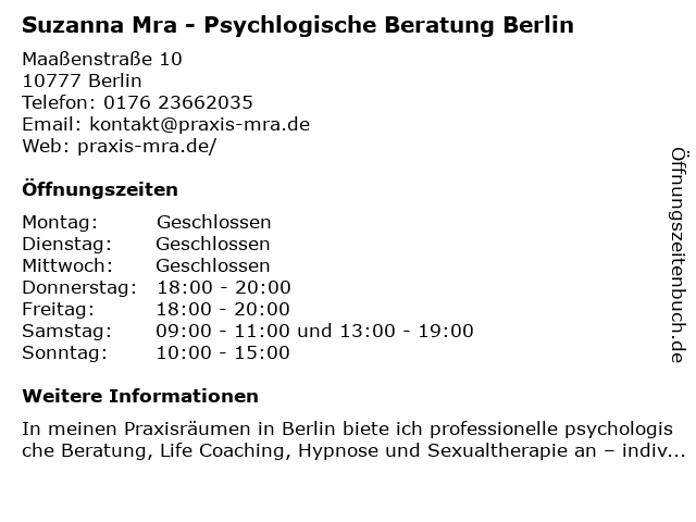 Branchen & Suchbegriffe zu Suzanna Mra - Psychlogische Beratung Berlin:beratung, hypnosetherapie, lebenscoaching, mra, psychlogische, suzanna |