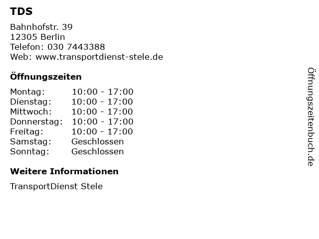 | Öffnungszeiten TDS in Berlin anzeigen | |