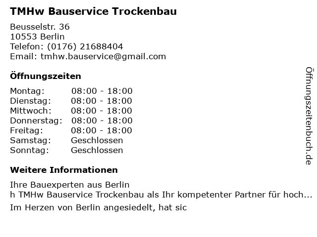 | Öffnungszeiten TMHw Bauservice Trockenbau in Berlin anzeigen | |