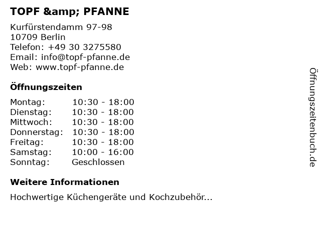 | Öffnungszeiten TOPF & PFANNE in Berlin anzeigen | |
