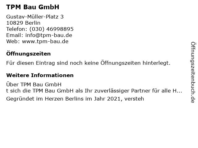 | Öffnungszeiten TPM Bau GmbH in Berlin anzeigen | |