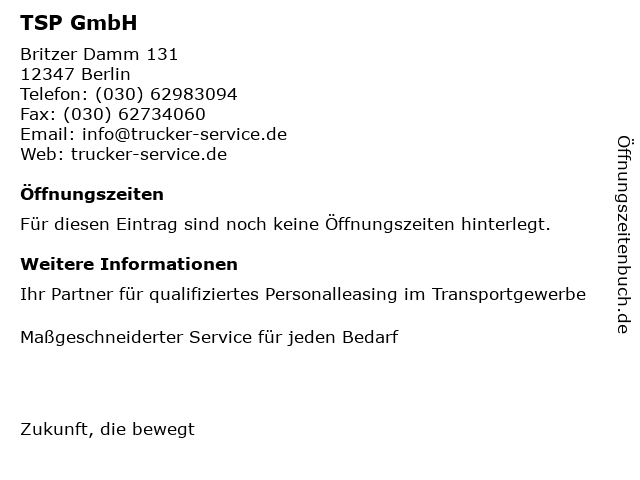 | Öffnungszeiten TSP GmbH in Berlin anzeigen | |