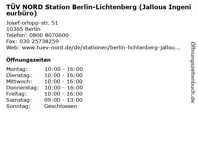 Branchen & Suchbegriffe zu TÜV NORD Station Berlin-Lichtenberg (Jallous Ingenieurbüro):autowerkstatt, ingenieurbüro, jallous, nord, station, tüv |