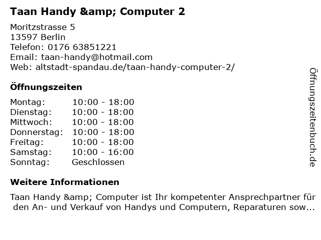 | Öffnungszeiten Taan Handy & Computer 2 in Berlin anzeigen | |