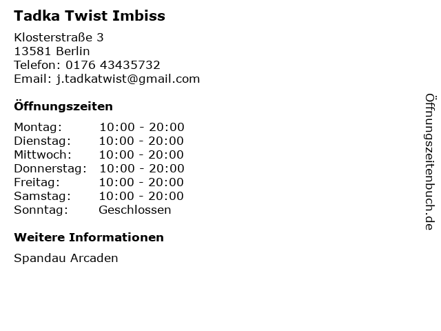 | Öffnungszeiten Tadka Twist Imbiss in Berlin anzeigen | |