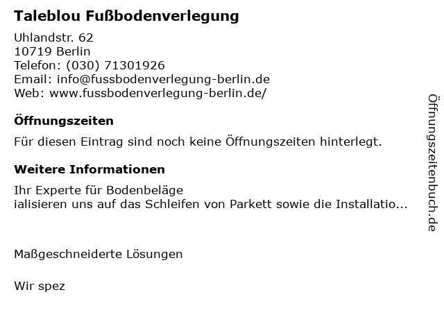 | Öffnungszeiten Taleblou Fußbodenverlegung in Berlin anzeigen | |