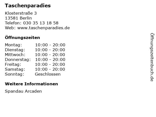 | Öffnungszeiten Taschenparadies in Berlin anzeigen | |