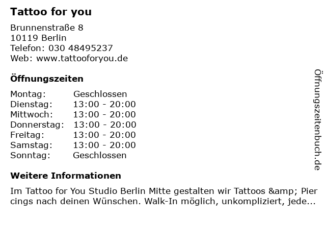 | Öffnungszeiten Tattoo for you in Berlin anzeigen | |