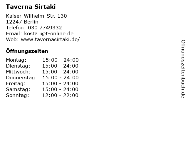 | Öffnungszeiten Taverna Sirtaki in Berlin anzeigen | |
