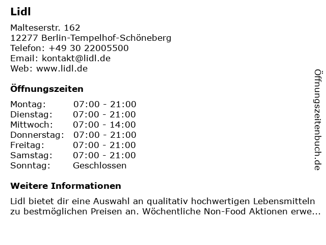 | Öffnungszeiten Lidl in Berlin-Tempelhof-Schöneberg anzeigen | |