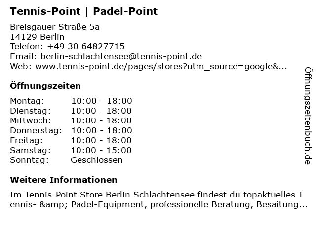 | Öffnungszeiten Tennis-Point | Padel-Point in Berlin anzeigen | |