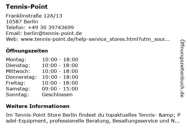 Öffnungszeiten Tennis-Point in Berlin anzeigen | |