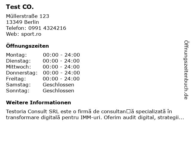 | Öffnungszeiten Test CO. in Berlin anzeigen | |