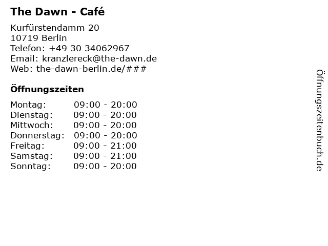 | Öffnungszeiten The Dawn - Café in Berlin anzeigen | |